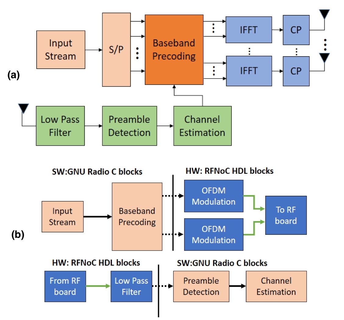 Fig. 1: Proposed multi-user energy transmission and scheduling. (a) multi-user MIMO-OFDM beamforming physical layer, (b) Processing showing SW/HW divide.
