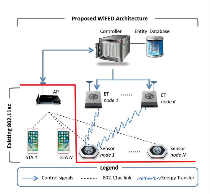 9. WiFi Friendly Energy Delivery with Distributed Beamforming. High power radiation within the ISM band interferes with the packet reception for existing WiFi devices. We devised the first system that merges the RF energy transfer functions within a standards compliant 802.11 protocol to realize practical and WiFi-friendly Energy Delivery (WiFED). We designed and implemented a software-defined architecture composed of a centralized controller that coordinates the actions of multiple distributed energy transmitters (ETs), and then integrated specific features of 802.11 within sensor control plane for requesting and monitoring energy. Additionally, we devised a controller-driven bipartite matching-based algorithmic solution that assigns the appropriate number of ETs to energy requesting sensors for an efficient energy transfer process. We demonstrated our WiFi-friendly distributed energy transfer through a practical system in software-defined radio testbed and extensive simulations.