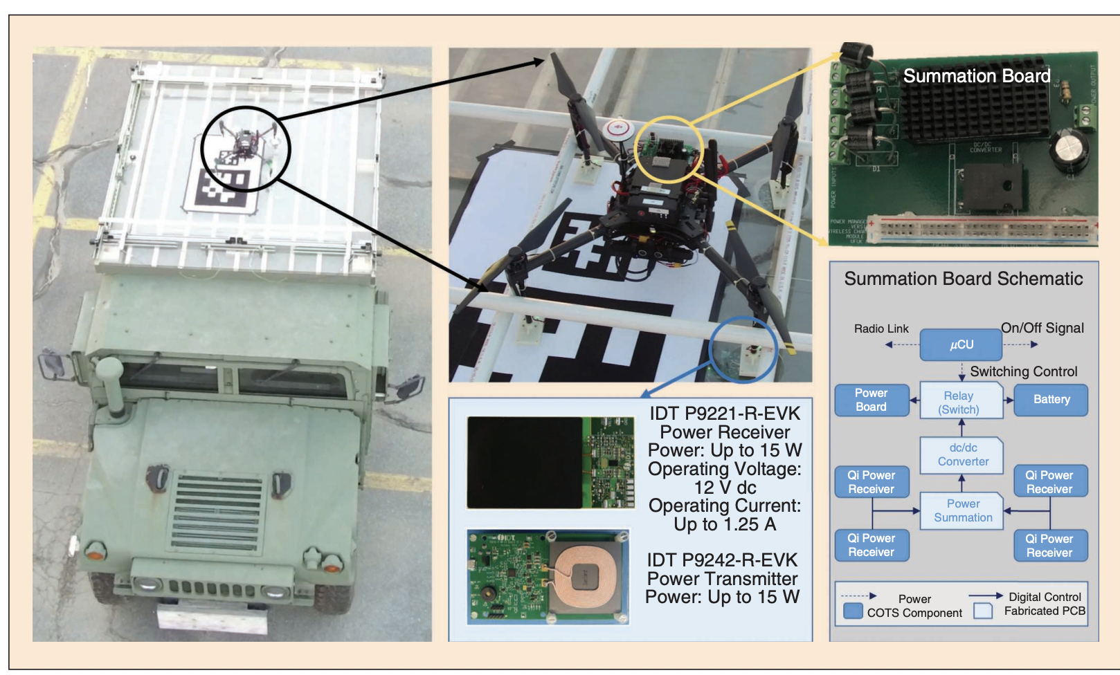 Fig. 14. The UAV charging infrastructure, onboard power management fabricated circuit, and schematic. PCB: printed circuit board.